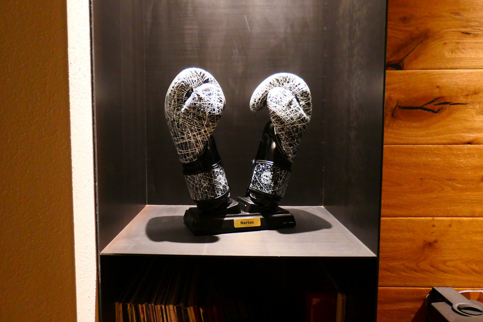 Gefertigt wird der Boxhandschuhhalter aus einem modernen Verbundmaterial bestehend aus mineralischer Basis und Acrylharz. Das Ergebnis ist härter als Gips, weniger spröde als Beton und überzeugt durch eine feine, hochwertige Oberfläche.