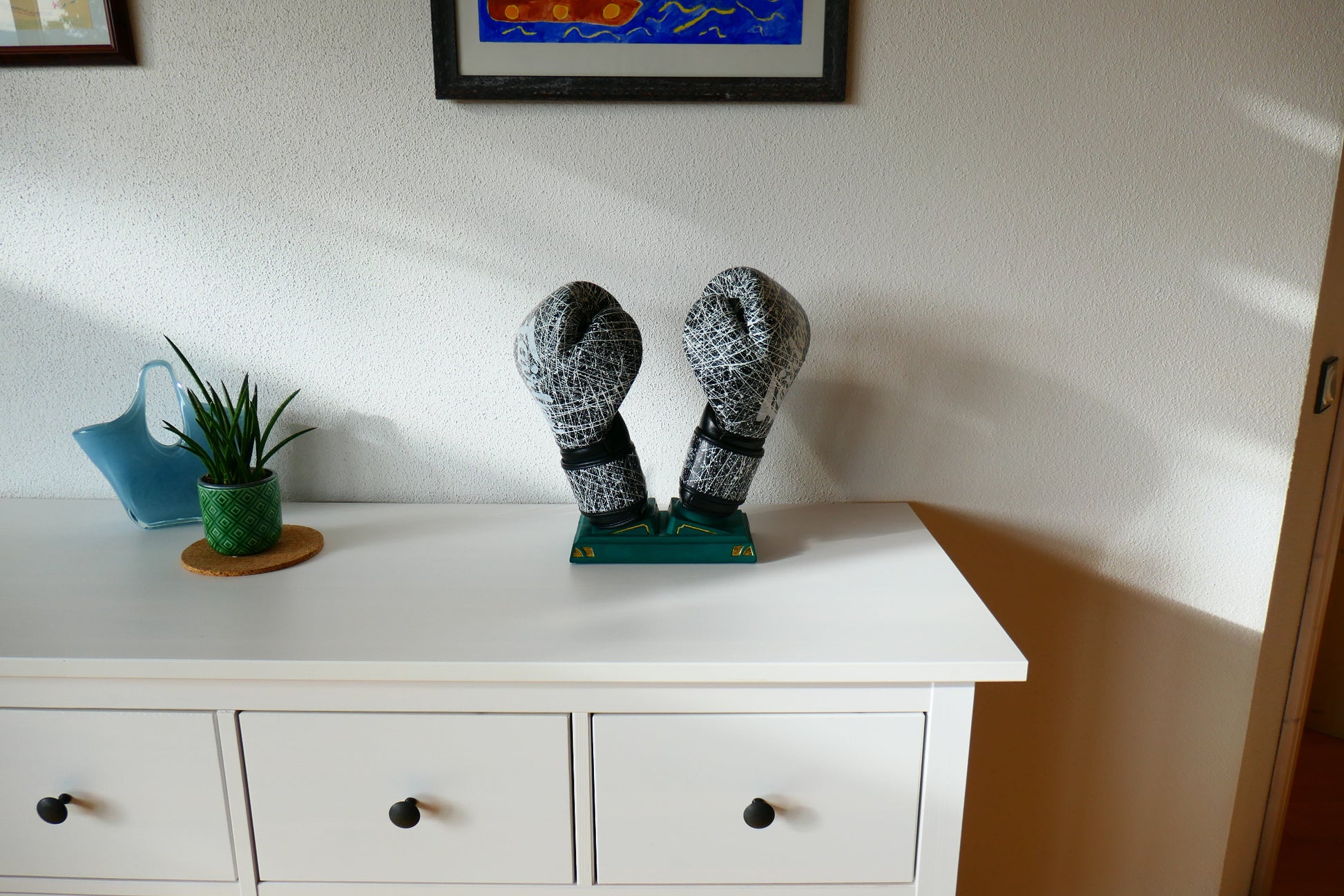 Es wurde auf eine leicht Marmorierte grüne Handschuhalterung in aufwendiger Handarbeit 24k Blattgold angebracht. Das echt Gold harmoniert hervorragend mit dem Grün des Halters und glänzt warm.
